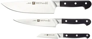 W skład profesjonalnego zestawu wchodzą 3 najlepsze noże z serii Zwilling Pro - nóż szefa kuchni, nóż do krojenia w plastry i nóż do warzyw. Noże są doskonale wyważone, dobrze leżą w dłoni i mają unikalne ostrze w kształcie klina, które ułatwia i zapewnia bezpieczeństwo krojenia. W serii Pro wprowadzono także ulepszony kształt jelca, który nie tylko skutecznie chroni palce, ale także stanowi pewne oparcie dla palców i równoważy cały nóż, dzięki czemu używanie noży jest wygodniejsze, a przede wszystkim bezpieczniejsze. Stożkowy kształt oznacza również większą kontrolę nad krojeniem i pozwala na pełne naostrzenie noża. Docenisz tradycyjną konstrukcję noża z pełną klingą i 3 solidnymi nitami.