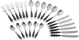 z nożami menuZestaw sztućców składający się z: 6 x noży do menu6 widelców6 x łyżek6 x łyżeczek do kawydla 6 osóbsolidna, kuta jakośćKolor uchwytu: CZARNYPlastikowe uchwyty, 3-krotnie nitowaneNoże ze specjalnymi ząbkowanymi ostrzamipolerowana stal nierdzewna 18/0można myć w zmywarcemożliwość przedłużenia w dowolnym momencieOstrza noży są okrągłe, stożkowe (pokazane na 1. zdjęciu)szczególnie nadaje się jako klasyczny nóż śniadaniowyRustykalno-uroczy klasyk. . . . . 6 x nóż obiadowy, 6 x widelec, 6 x łyżka, 6 x łyżeczka do kawydla 6 osóbsolidna, kuta jakośćKolor rękojeści: CZARNY, plastikowe uchwyty potrójnie nitowanepolerowana stal nierdzewna 18/0, można myć w zmywarcemożliwość przedłużenia w dowolnym momencieOstrza noży są zaokrąglone (pokazane na 1. zdjęciu)szczególnie nadaje się jako klasyczny nóż śniadaniowyRustykalny urok klasyki.