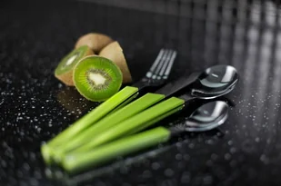 Eleganckie sztućce wykonane z wysokiej jakości stali nierdzewnej oraz tworzywa sztucznego. Rączki sztućców zostały ozdobione kolorem zielonym. Wygodny i ergonomiczny kształt sztućców pozwala na bezpieczne i przyjemne spożywanie posiłków.
