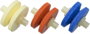 MinoSharp Zestaw 3 ceramicznych kamieni do ostrzałek PLUS 3 550Trzy zapasowe kamienie ostrzące przeznaczone dla ceramicznych ostrzałek wodnych MinoSharp PLUS 3 z serii 550. W zestawie znajduje się koło niebieskie (grube ziarno), koło brązowe (średnie ziarno) i koło żółte (drobne ziarno). Wymiana kamieni odbywa się w prosty sposób: wystarczy wcisnąć nowe koła w miejsce starych i sprawdzić, czy obracają się swobodnie. Średnica kółka: