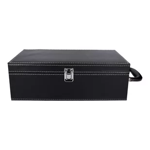 Skrzyneczka na 2 butelki wina - czarna skóra Eleganckie opakowanie na butelkę wina lub innego alkoholu. Solidne i estetyczne wykończenie sprawia że jest to idealny prezent na różne okazje - ślub, urodziny czy imieniny. Skrzynka obita jest czarną skórą ekologiczną. Wewnątrz jest czarna welurowa wyściółka oraz taśma z rzepem do utrzymania butelki. Produkt posiada wygodną rączkę, zamki oraz przegródki zabezpieczające butelki przed stłuczeniem.