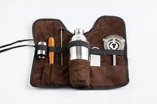 Podróżny zestaw barmański w etui - 7 elementów srebrny połysk Zestaw barmański jest idealnym rozwiązaniem do zastosowania w każdym nowoczesnym domu. Twoi goście będą zaskoczeni oryginalnym sposobem przygotowywania drinków. Poręczne etui ułatwia organizację i przechowywanie akcesoriów po zakończeniu miksowania. Zestaw składa się z następujących elementów: 1 x shaker cobbler (trzy-częściowy z sitkiem) 750 ml 1 x korkociąg 1 x filtr z płaską rączką "strainer" 1 x łyżka barmańska z podstawką 1 x drewniany ubijak barmański "muddler" 1 x dwustronna miarka 15 ml/30 ml - "jigger" z oznaczeniem pojemności na wewnętrznej ściance 1 x etui Kolor akcesoriów: