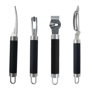 Zestaw 4 noży barmańskich do cytrusów Zestaw 4 noży barmańskich do cytrusów przyda się zarówno w profesjonalnym drinkbarze, jak i każdemu fanowi robienia drinków w domu. Z zestawem 4 noży barmańskich każdy może wznieść przygotowywanie drinków na wyższy poziom. Wiadomo przecież, że liczy się nie tylko smak drinka, ale również jego wygląd. Do tego by przygotować piękne dekoracje z owoców przyda się zestaw 4 noży barmańskich, na który składają się: Nóż do zestów i twistów z cytrusów 16,5 cm Nóż dekoracyjny do owoców 19,5 cm o precyzyjnym ostrzu Obieraczka do cytrusów 21 cm Nóż do dużych twistów z cytrusów 17 cm Zestaw 4 noży barmańskich do cytrusów - wysoka jakość Noże wykonane są z wysokiej jakości stali nierdzewnej.