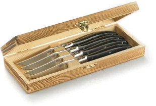 Komplet czterech ząbkowanych noży do steków i dań z grilla zamkniętych w sosnowym pudełku.