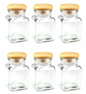6x Słoiki na przyprawy 150 ml z eleganckim drewnianym zamknięciem Wymiary wysokość z korkiem - 9,8 cm szerokość podstawy - 5,6 x 5,6 cm podstawa - kwadratowa...