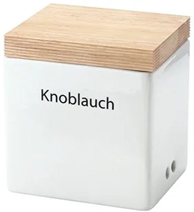 Ceramiczny pojemnik na żywność z drewnianą pokrywką wykonany z drewna kauczukowego, przeznaczony jest do przechowywania różnych produktów spożywczych, takich jak czosnek, cebula itp. W zestawie znajdują się usuwalne etykiety do naklejenia na pojemnik. Ceramika jest szkliwiona i nadaje się do mycia w zmywarce. Drewniana pokrywa nie nadaje się do mycia w zmywarce.