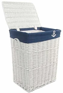 Wiklinowy kosz na pranielakierowany na białonadaje się do łazienki, salonu, sypialniWymiary (szer. x wys. x gł.): 48x62x36cmz pokrywą, granatową z kotwicą, zdejmowaną i nadającą się do praniaz pokrywąz uchwytami do przenoszeniaReklamy produktów z zewnętrznych stron internetowych
