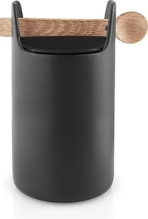 Pojemnik na akcesoria kuchenne to część wyśmienitej serii wyposażenia kuchennego od producenta Eva Solo Modny oryginalne i przede wszystkim użyteczny dodatek do każdego typu wnętrza Produkt wykonany jest z wysokiej jakości ceramiki w czarnym kolorze o matowym wykończeniu Jest to jedna z kilku wersji pojemników tej serii W tym przypadku funkcję rączki pełni łyżeczka którą można swobodnie wyciągnąć i używać do przygotowania sałatki czy zupy Pojemnik został uzupełniony także szczelną pokrywką co daje nam znacznie więcej możliwości jego użytku Poza zastosowaniem jako pojemnik na sztućce można także z powodzeniem wykorzystać go do przechowywania cukru mąki czy herbaty Wymiary: średnica 11 5 cm wysokość 20 cm