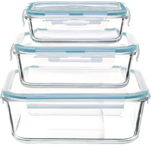 Niezbędnymi przedmiotami w każdej kuchni są szklane pojemniki z pokrywką do przechowywania żywności. 3 sztuki w zestawie nie są jednakowych rozmiarów, dzięki czemu gdy są puste, można przechowywać je, jedna w drugiej, co zaoszczędzi w kuchni trochę miejsca. Hermetycznie zamykane pojemniki na jedzenie wykonane zostały ze szkła żaroodpornego, dzięki czemu świetnie nadają się do umieszczenia w piekarniku, ale również do podgrzania w nich posiłku w kuchence mikrofalowej.