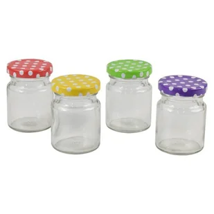 Zestaw 12 słoiczków z grubego szkła o pojemności 90ml. Posiadają nakrętki w różnych kolorach. Idealnie nadają się do przechowywania miodu, przypraw, sosów lu...