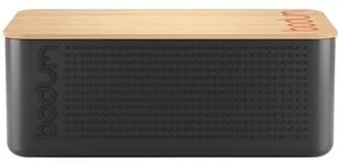 - duży chlebak na pieczywo, - wykonany z tworzywa sztucznego w czarnym kolorze oraz bambusa, - pokrywki można używać jako deski do krojenia - jedna str.