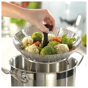 - składana wkładka parowa do garnków o średnicy od 18 do 27 cm,- składane nóżki pokryte silikonem, które zapobiegają porysowaniu patelni,- teleskopowy uchwyt dla zapewnienia bezpiecznej odległości od gorącej misy i zaoszczędzenia miejsce przy przechowywaniu,- wysokiej jakości stal nierdzewna/ tworzywo sztuczne,- produkt nadaje się do mycia w zmywarce,- 5- letnia gwarancjaWymiary: