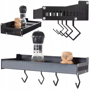 PÓŁKA KUCHENNA WISZĄCA ŚCIENNA NA PRZYPRAWY WIESZAK ALUMINIUM Solidnie wykonana wisząca półka kuchenna znajdzie swoje zastosowanie w kuchni, łazience, przedpokoju, pokoju, sypialni, a nawet biurze lub gabinecie. Półka jest nierdzewna, wykonana z aluminium malowanego proszkowo na czarny kolor, co pozytywnie wpływa na stabilność i solidność całej konstrukcji. Wyposażona jest w cztery, podwieszane haczyki (które można zdemontować), na których można zawiesić ręcznik, przybory kuchenne, itp. Dzięki swojemu uniwersalnemu kształtowi świetnie będzie się prezentowała w pomieszczeniach nowoczesnych, industrialnych, jak również tradycyjnych. Świetnie sprawdzi się jako półka na przyprawy w kuchni, kosmetyki w łazience, ale również na obrazki, pamiątki oraz ramki ze zdjęciami.