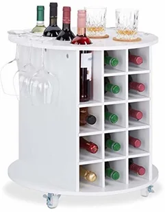 ok. 8 cm - Maksymalne obciążenie: 30 kg - Materiały: MDF, tworzywo sztuczne - Waga: ok. 13 kg Wózek na białe wino - Wózek do serwowania wina, whisky lub wina musującego - Całkowicie w dyskretnym białym kolorze - 6 eleganckich uchwytów na kieliszki do wina - możliwość przechowywania 17 butelek pionowo lub poziomo - Kółka obrotowe 360 Zakres dostawy - 1x stojak na wino w pojedynczych częściach - Z materiałem montażowym - Z instrukcją - Elementy dekoracyjne nie wchodzą w zakres dostawy