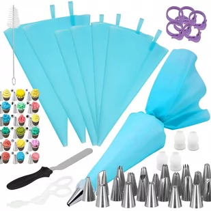 Zestaw zawiera: 1x etui do przechowywania + separatory: 19,5 x 13 x 3,5m 48x tylki o różnych końcówkach: 3 x 1,5 cm 6x przeźroczyste adaptery do tylek 1x gwóźdź dekoracyjny 1x nożyczki do usuwania gwoździ 1x czyścik 6x gumowe pierścienie do rękawów cukierniczych 1x szpatułka kątowa: 22,5 x 2,5 cm 4x rękawy silikonowe: