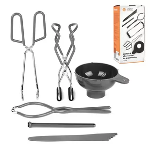 Zestaw 6 akcesoriów do robienia przetworów Tadar składa się z chwytaka i otwieracza do słoików, lejka, łopatki do odpowietrzania konfitur, szczypiec metalowych oraz magnetycznego podnośnika do zakrętek. Wysoka temperatura wyparzania słoików i nakrętek jest ci więc niestraszna. Równie sprawnie i bezpiecznie poradzisz sobie z wytrawnymi, jak i słodkimi przetworami. Komplet 6 akcesoriów do weków Tadar wesprze cię w np. sezonowym użytkowaniu powidlaka.