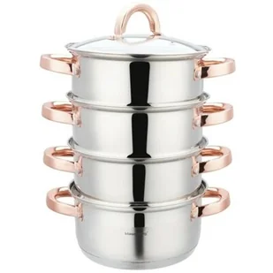 Komplet garnków do gotowania na parze wykonany jest z wysokiej jakości stali nierdzewnej. Wykorzystana stal składa się z najlepszej jakości stopu powszechnie stosowanego w światowej klasy produktach, co gwarantuje jej wysoką odporność na korozję oraz bardzo dobrą wytrzymałość. Zastosowany materiał umożliwia szybkie podgrzanie potraw i przez dłuższy czas utrzymuje ciepło. Produkt przystosowany do gotowania na kuchenkach indukcyjnych, gazowych, elektrycznych, ceramicznych i halogenowych. Można go bezpiecznie myć w zmywarkach.