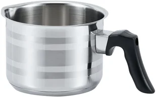 Garnek do mleka polerowany w paski ze szlachetnej stali nierdzewnej. Posiada zawijany brzeg. Wnętrze jedwabiście matowe. Dno termiczno-warstwowe szybko pobiera i trzyma ciepło. Średnica: 12cm Wysokość: