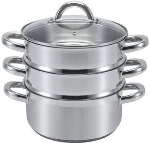 Garnek 4 częściowy do gotowania na parze ze szlachetnej stali nierdzewnej. Zestaw zawiera 2 wkłady i szklaną pokrywkę. W pokrywce znajdziemy otwór na ujście pary wodnej. Garnek z zewnątrz jedwabiście matowy z wypolerowanym paskiem i chromowanym brzegiem. Wewnątrz znajduje się miarka.
