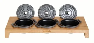 Elegancki bambusowy stojak na 3 żeliwne mini garnki typu "Cocotte" francuskiego producenta Staub może służyć do stylowego, praktycznego i bezpiecznego serwowania potraw z mini garnków tej samej marki o średnicy 10 cm. Już na pierwszy rzut oka bambusowy stojak zachwyca swoim gustownym designem, który pięknie komponuje się z każdym stylem ustawienia i wyposażenia kuchni. Stelaż posiada 3 okrągłe otwory, w które dokładnie wpasowują się garnki o średnicy 10 cm oraz 3 podłużne otwory, w które wygodnie można włożyć pokrywki podczas posiłku. Bambusową podstawkę można łatwo połączyć z wszystkimi kolorami mini garnków, aby uzyskać jeszcze bardziej spektakularną prezentację potraw. Dzięki stojakowi można bezpiecznie chronić powierzchnię stołu przed gorącymi potrawami dopiero co wyjętymi z piekarnika lub zdjętymi z kuchenki.
