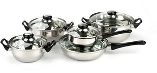 10-częściowy zestaw garnków na pewno wykorzystasz podczas codziennego gotowania. Zestaw jest wykonany ze stali nierdzewnej, posiada szklane pokrywki z otworem do uniku pary. Garnki mają czarne uchwyty. Nierdzewne garnki można myć w zmywarce, jednak częste mycie z użyciem długich programów i agresywnych środków myjących może spowodować nieodwracalne zmiany na powierzchni. Garnki nie są przeznaczone do używania na płycie indukcyjnej.