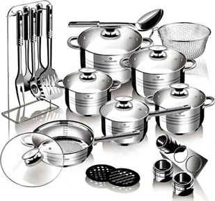 stal nierdzewna - zawiera: Rondel z pokrywką 24 x 14,5 cm, 20 x 12,5 cm, 18 x 11,5 cm, 16 x 10,5 cm - rondel z pokrywką 16 x 10,5 cm - patelnia z pokrywką 24 x 6,5 cm - 7-częściowy zestaw przyborów kuchennych ze stojakiem - zestaw do przypraw 3 szt. na tacy magnetycznej - 2 szt. Koszyk do smażenia ze zdejmowanym uchwytem - 5-warstwowa podstawa - nitowane uchwyty dla bezpiecznego użytkowania - nadaje się do wszystkich typów płyt, w tym indukcyjnych - można myć w zmywarce - skala pomiarowa - uchwyty i rączki ze stali nierdzewnej