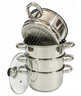 ⭐⭐⭐⭐⭐ Garnek do gotowania na parze 24 cm 5 elementów 3 POZIOMY GOTOWANIA ✅ Ilość elementów: 5 ( 3 x sito - parownik, 1 x garnek na wodę, 1 x pokrywka ) Średn...