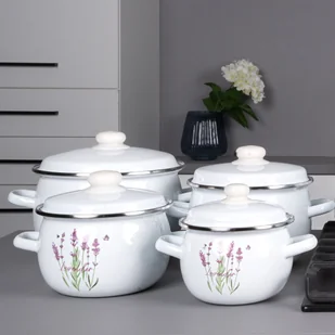 Komplet garnków emaliowanych LAWENDA 1,5l/2,5l/3,5l/5l - kompletny zestaw białych garnków do gotowania w pięknej dekoracji Garnki emaliowane to naczynia których często używały nasze mamy i babcie, jednak wciąż są chętnie wybierane jako naczynia go gotowania. Ich popularność nie mija, dzięki funkcjonalności i barwności wzorów o czym przekonuje komplet białych garnków z dekoracją Lawendy, który wpiszę się w stylistykę większości kuchni, szczególnie w stylu klasycznym i tradycyjnym. Zestaw składa się z 4 garnków z pokrywkami o beczułkowatym kształcie i pojemnościach: 1,5l, 2,5l, 3,5l i 5l, co tworzy kompletny zestaw do gotowania różnych potraw w zależności od potrzeb: zup, ziemniaków, makaronów, sosów czy jednogarnkowych dań.