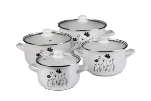 DO-0145 - Wzór: łąka - Materiał: stal węglowa emaliowana / szkło - Ilość w zestawie: 8 elementów: 4 garnki + 4 pokrywki