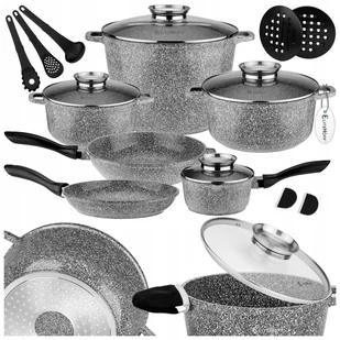 KOMPLET GARNKÓW NA INDUKCJĘ / GAZ ZESTAW GARKÓW MARMURKOWYCH 17 ELE ELITEHOFF ⭐ Dlaczego warto wybrać zestaw garnków Elitehoff? Trwałość na lata – Wysokiej jakości marmurkowa powłoka zapewnia odporność na zarysowania i długowieczność. Gotowanie bez stresu – Szklane pokrywki umożliwiają kontrolę potrawy bez podnoszenia, oszczędzając czas i energię. Na każdą kuchenkę – Komplet garnków nadaje się na indukcję, gaz, ceramikę i elektrykę. Wszystko, czego potrzebujesz – Zestaw 17 elementów, w tym różne garnki, patelnie i akcesoria, ułatwia gotowanie każdej potrawy. Elegancki design – Nowoczesna, marmurkowa powłoka doda stylu każdej kuchni.