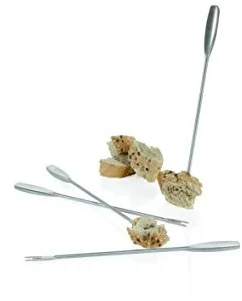 Zestaw 4 widelczyków do fondue z linii Monaco+ Materiał: stal szczotkowana Można myć w zmywarce Przybliżone wymiary widelca: długość 21,8 cm Przybliżone wymiary brutto: wysokość 28 cm, długość 8,4 cm, szerokość 2,5 cm Przybliżona waga brutto: 0,100 kg Opakowanie: