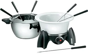 Unold 48615 Zestaw do fondue 500 W garnek do fondue ze stali nierdzewnej dla maksymalnie 6 osób Mały, ale potężny Wielofunkcyjny elektryczny zestaw do fondue dla sześciu osób Wszystko w jednym: fondue mięsne, fondue serowe i fondue czekoladowe. Niemożliwe? Można - z zestawem FONDUE SET od UNOLD®. Oprócz garnka ze stali nierdzewnej do klasycznego mięsnego fondue, na wierzchu znajduje się teraz jeszcze jeden: pięknie ukształtowany, niezniszczalny ceramiczny garnek, w którym można bardzo delikatnie stopić czekoladę lub ser.