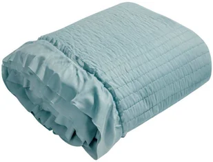 Dziewczęca narzuta na łóżko z lekko połyskującej tkaniny. Pikowana za pomocą przeszyć w cienkie paski kapa obszyta jest na krawędziach marszczoną falbaną.