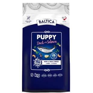Baltica Puppy Salmon with Duck XS/S 9kg karma z kaczką i łososiem dla szczeniąt małych ras✅Bezzbożowa, pełnoporcjowa, karma super premium dla szczeniąt od 4 tygodnia do 12 miesiąca życia. Stworzona na bazie wybornego mięsa kaczki i łososia z dodatkiem dyni, pietruszki owoców polskiej jabłoni, gruszki, dzikiej róży oraz czarnej porzeczki. Wykwintna uczta, która sprosta wymaganiom najbardziej wybrednym szczenięcym podniebieniom. ✅Zwiększony poziom kwasów tłuszczowych Omega-3 pochodzących ze świeżego oleju z łososia wspiera prawidłowy rozwój układu nerwowego oraz proces kształtowania funkcji poznawczych. Optymalny poziom składników odżywczych, chrotektujących oraz zrównoważony poziom wapnia do fosforu warunkują mocne kości i prawidłowy rozwój stawów aby zapobiec ich deformacjom.