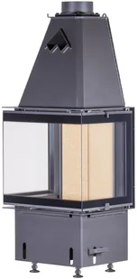 Kominek z przeszkleniem po obu stronach (trzyszybowy) otwierany na bok. Drzwiczki otwierają się jak w modelu narożnym. Możliwość doprowadzenia powietrza do komory spalania z zewnątrz. Posiada wbudowaną przepustnicę świeżego powietrza do sterowania procesem spalania bezpośrednio w urządzeniu oraz króciec fi 125 mm przyłączeniowy. Szyby łączone bez szprosa. Konstrukcja wkładów kominkowych Kobok wykonana jest ze stali, uzupełniona żeliwnym rusztem oraz pomalowana ekologiczną farbą. Komora spalania wyłożona jest szamotem o grubości 5 cm oraz posiada żeliwny ruszt i pojemny popielnik. Drzwiczki przeszklone specjalną przeźroczystą ceramiką wytrzymującą 750°C z bardzo estetycznym wykończeniem od środka ze stali nierdzewnej.