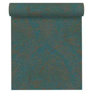 Tapeta winylowa na flizelinie z kolekcji Metropolitan St. 3 z motywem pieknego barokowego ornamentu w kolorach złota na turkusowym tle to elegancka dekoracja do wnętrz salonu, sypialni, jadalni w stylu klasycznym. Winyl odporny na zmywanie i szorowanie. Podłoże z flizeliny pozwala na łatwy montaż suchych pasów tapety na scianie posmarowanej klejem. Przed montażem należy zapoznać się z instrukcją podaną na etykiecie.