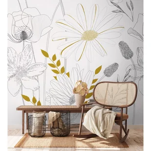 Tapeta panoramiczna winylowa na flizelinie z kolekcji THE WALL z motywem szaro żółtych kwiatów to radosna, odświeżająca wnętrze dekoracja ścian w pokoju dla młodzieży, salonu, sypialni, kuchni. Tapeta drukowana cyfrowo o wymiarach 159 x 280 cm składa się z trzech paneli z których każdy ma wymiar 53 x 280 cm. Winyl odporny na zmywanie i szorowanie. Podłoże z flizeliny pozwala na łatwy montaż suchych pasów tapety na ścianie posmarowanej klejem. Przed montażem należy zapoznać się z instrukcją podaną na etykiecie.