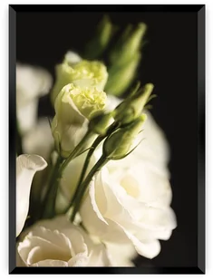 Plakat z motywem kwiatowym- bukietem białej eustomy na ciemnym tle. Delikatne eustomy pięknie kontrastują z ciemnym tłem plakatu. Będzie elegancką dekoracją salonu lub sypialni. Oryginalna dekoracja ściany w salonie, sypialni czy gabinecie. Doskonały pomysł na prezent.