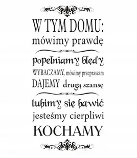 Przedmiotem sprzedaży jest naklejka ścienna z folii matowej, wycięta po obrysie, nie posiadająca tła: Napis na ścianę, naklejka - W tym domu - 174 Cena Kup Teraz dotyczy arkusza o rozmiarze: wys. 240 cm x szer. 120 cm O naszych naklejkach: Wykonane są one z wytrzymałej, wysokojakościowej, samoprzylepnej matowej folii winylowej.
