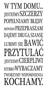 Przedmiotem sprzedaży jest naklejka ścienna z folii matowej, wycięta po obrysie, nie posiadająca tła: Napis na ścianę, naklejka - W tym domu . . .