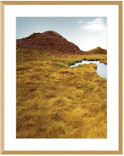 Obraz w ramie przedstawiający wyjątkowy krajobraz Szkocji. Niewysokie góry porośnięte złotą trawą i malownicze, spokojne jeziorka tworzą niezwykły pejzaż. Fotografia oprawiona białym passe partout i szeroką, złota ramą będzie elegancką dekoracją, która ożywi każdą ścianę. Do kompletu polecamy drugi obraz z tej samej serii. Wymiary ramki: