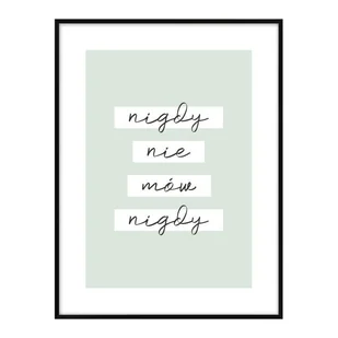 Obraz z sentencją Nigdy nie mów nigdy miętowy 30 x 40 cm jest minimalistyczny. Czarną wąską ramkę z efektem passe-partout połączono z subtelnym kolorem tła. Takie zestawienie doskonale zaprezentuje się we wnętrzu urządzonym w nowoczesnym stylu. Dekorację ścienną wykorzystasz też do urozmaicenia skandynawskiej aranżacji. Miętowy kolor będzie świetnie współgrał z szarością oraz drewnem.