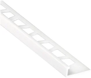 Profil krawędziowy wykonany z białego PVC o matowym wykończeniu. Jego kątowa konstrukcja została zaprojektowana do przyklejania płytek o grubości od 4 do 6 mm do ściany w celu ich ochrony i zapewnienia dekoracyjnego wykończenia konturów. Wymiary: 0,6 x 250 cm (szerokość x długość).