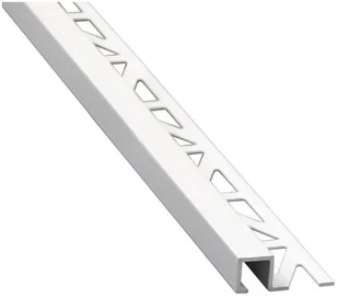 Kwadratowy profil krawędziowy z anodowanego na biało aluminium z błyszczącym wykończeniem. Jego wygięta konstrukcja jest przeznaczona do przyklejania do ściany i podłogi płytek o grubości od 10 do 12 mm, aby je chronić i zapewniać dekoracyjne wykończenie krawędzi. Wymiary: 1,2 x 250 cm (szerokość x długość).
