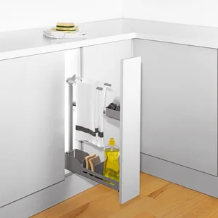 SNELLO 150 z półką i wieszakiem na ręczniki/ szary Wyciąg podblatowy do szafki wąskiej o szerokości frontu 150 mm. System posiada dwa wieszaki na ręczniki oraz dodatkowy pojemnik na ściereczki, który można z powodzenim zdjąć i wyczyścić. Dolna półka wykonana jest w linii Libell. Półka została doposażona w matę antypoślizgową, która zapobiega przesuwaniu się produktów podczas wysuwania i wsuwania, dodatkowo zabezpiecza dno półki i ułatwia utrzymanie czystości. Rama mocowana jest pod półką co umożliwia łatwy dostęp z obu stron wyciagu.