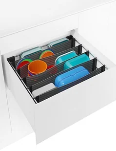SPACEFLEXX 600 Organizer do przechowywania pojemników na żywność System SpaceFlexx składa się z bocznych chromowanych ramek i wewnętrznych pięciu elastycznych przegródek, które dostosowują się do rozmiaru i kształtu przechowywanych przedmiotów Podziały wewnątrz systemu zostały wykonane z oryginalnego tworzywa opartego na specjalnym zaawansowanym technologicznie materiale, który daje elastyczność i możliwość prania w pralce. SpaceFlexx ma dwustopniową regulację szerokości: 472 mm lub 520 mm i pasuje do szuflad o szerokości frontu od 600 mm. Przy zastosowaniu systemu w większej szufladzie pozostaje wolna przestrzeń do zagospodarowania.