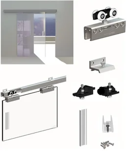 wózek z zaciskiem mocującym(2szt.), klamra ścienna(5szt.), klipstoper(1szt.), stoper(1szt.), prowadnik uniwersalny, regulowany(1szt.),przeźroczysty, przyklejany uchwyt do drzwi,wkładki elastomerowe do grubości 8,10 i 12 mm specjalna ściereczka do odtłuszczenia szkła , kpl. wkrętów, kołki oraz klucz imbusowy o wydłużonym ramieniu, pozwalający na mocniejsze dociągnięcie śrub.