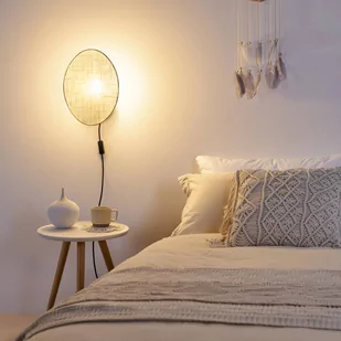 Z wtyczką i wyłącznikiem: lampa ścienna Boho Dream Lampa ścienna Boho Dream nawiązuje do naturalnego stylu wyposażenia wnętrz. Okrągły dysk wykonany z tkaniny w kolorze beżowym tworzy prosty klosz, za którym znajduje się oprawa na źródło światła - z włącznikiem/wyłącznikiem na kablu