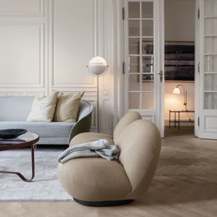 Połączenie chromu i bieli współgra z wieloma wariantami wyposażenia wnętrz. Lampa podłogowa duńskiego producenta oświetlenia i mebli Gubi imponuje doskonałą jakością, która wyróżnia produkty tego producenta.