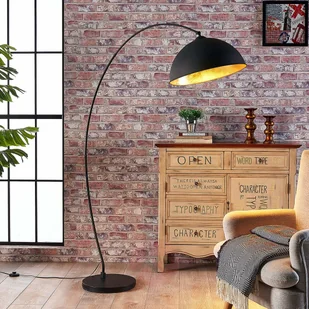 Atrakcyjna lampa stojąca Jonera w kształcie łuku z czarno-złotym kloszem.